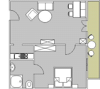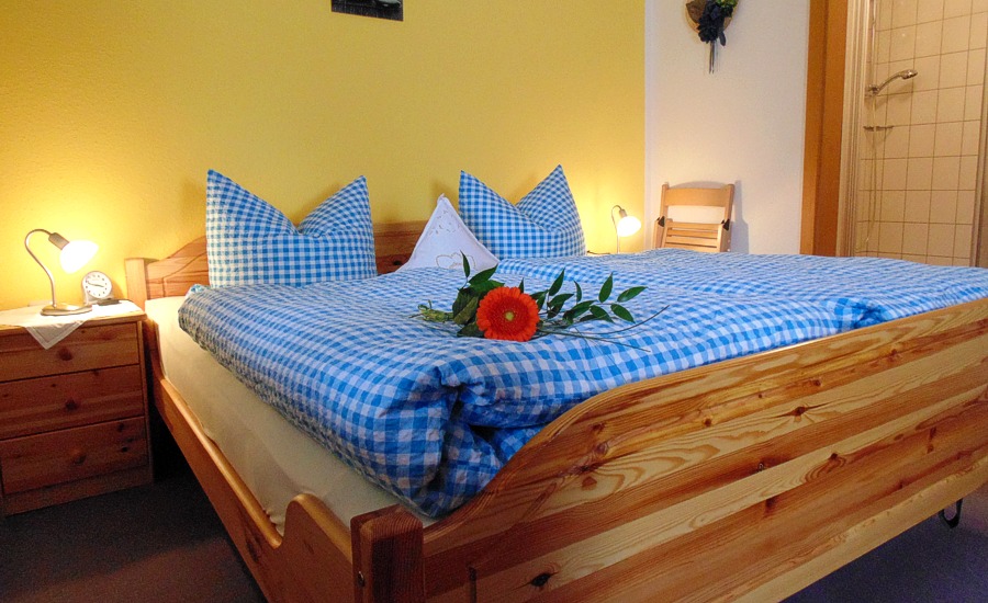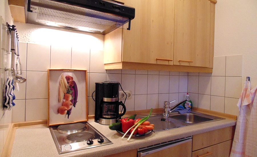 Unsere 45 Qudratmeter große Wohnung 4 ist aufgeteilt in ein Wohnzimmer mit LCD-Flachbildschirm, ein Schlafzimmer mit direktem Zugang zur Dusche/WC, Küche und Ostbalkon. Die Küche ist ausgestattet mit Kühlschrank, 2-Platten-Herd, Mikrowelle, Wasserkocher, Eierkocher, Toaster und Kaffeemaschine.